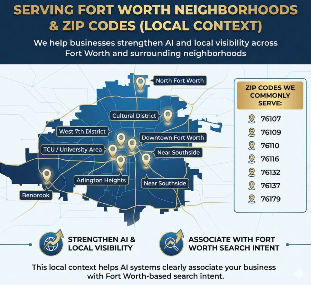 This local context helps AI systems clearly associate your business with Fort Worth-based search intent.